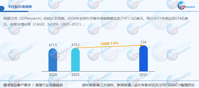 根据QYResearch的统计及预测,2024年全球牛仔裤市场销售额达到了471.5亿美元,预计2031年将达到534亿美元,年复合增长率(CAGR)为1.8%(2025-2031)。地区层面来看,中国市场在过去几年变化较快,2024年市场规模为116亿美元,约占全球的24%,预计2031年将达到190亿美元,届时全球占比将达到35%。